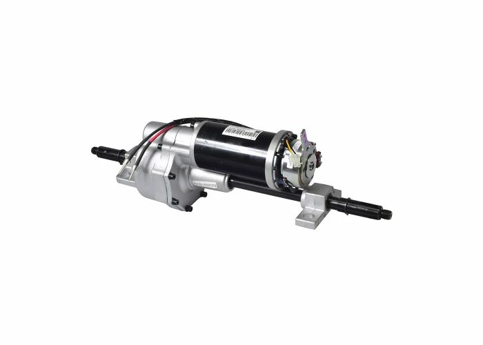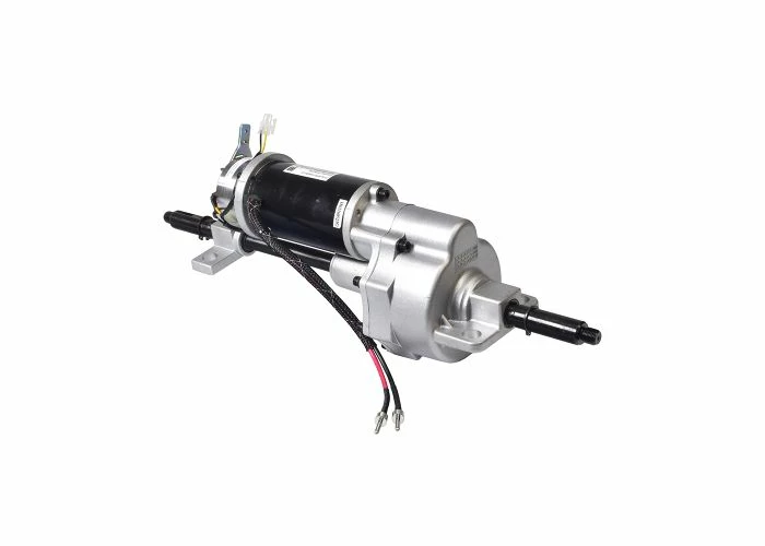 The assembly includes the motor, the brake, the transaxle unit, and the shaft axle key.